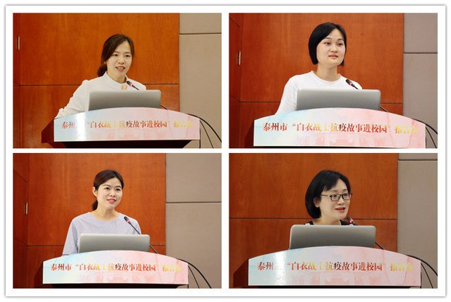 来自泰州市援湖北医疗队的4名队员向老员工们宣讲了他们在湖北的抗疫故事。泰州市人民医院援湖北医疗队是泰州市最早出征、最晚归来的一支医疗队,也是唯一的一支专业护理队伍,他们由10名女护士和5名男护士组成,15人中年龄最大的34岁,最小的仅26岁。他们在湖北抗疫71天,转战了两家医院,取得了患者零死亡、医务人员零感染的好成绩,出色地完成了援助任务。宣讲人李瑗动情地讲述泰州市人民医院援湖北医疗队的感人故事。泰州市第三批援湖北医疗队队员、兴化市人民医院主管护师曹蕴娇讲述了她所在团队护士张颖的故事。张颖和男朋友王开迪原准备春节正月初六举办婚礼,请柬都已经发出,因为抗疫工作的需要,张颖主动请战上一线,和男朋友王开迪商定推迟了婚礼,千里驰援湖北黄石,在湖北共战“疫”39天。援湖北医疗队队员杨芳讲述了泰州市中医院援湖北医疗队发挥中医特长,组成中医医疗小分队、中医护理小组,对方舱内病人实施中医中药辨证治疗,队员们还教会患者打中华五禽戏、八段锦,把中医技艺传播到异地他乡,让岐黄之光,照亮方舱。泰州市第二批援湖北医疗队队员、泰州市姜堰中医院护理部主任丁雅琴讲述了自己及15名援湖北医疗队友“逆行而上”的壮举,在疫情的面前,他们只有一个名字:那就是白衣战士!那白衣战袍之下跳动着一颗又一颗火热的赤子之心。